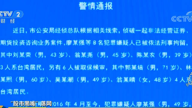 央视网消息:7月15日晚间,上海市公安局侦破了一起非法经营证券期货投资咨询业务的案件,廖某强等8位嫌疑人被非法刑事拘留。事实上,廖某强正是曾经的证券节目主持人廖英强。